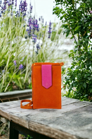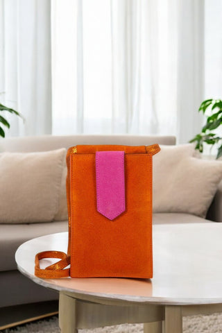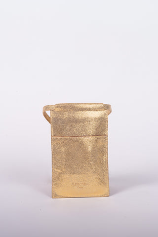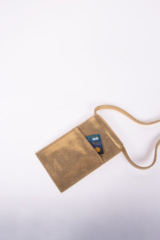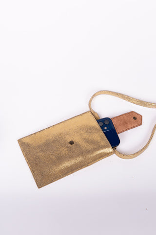 Pochette téléphone en véritable croûte de cuir de vachette avec mix de cuirs métallisés et/ou pailletés selon les coloris