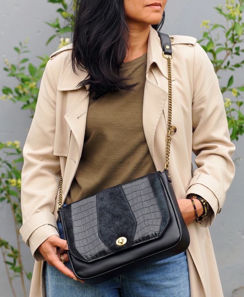Sac en véritable cuir de vachette avec mix de cuirs métallisés et/ou pailletés selon les coloris