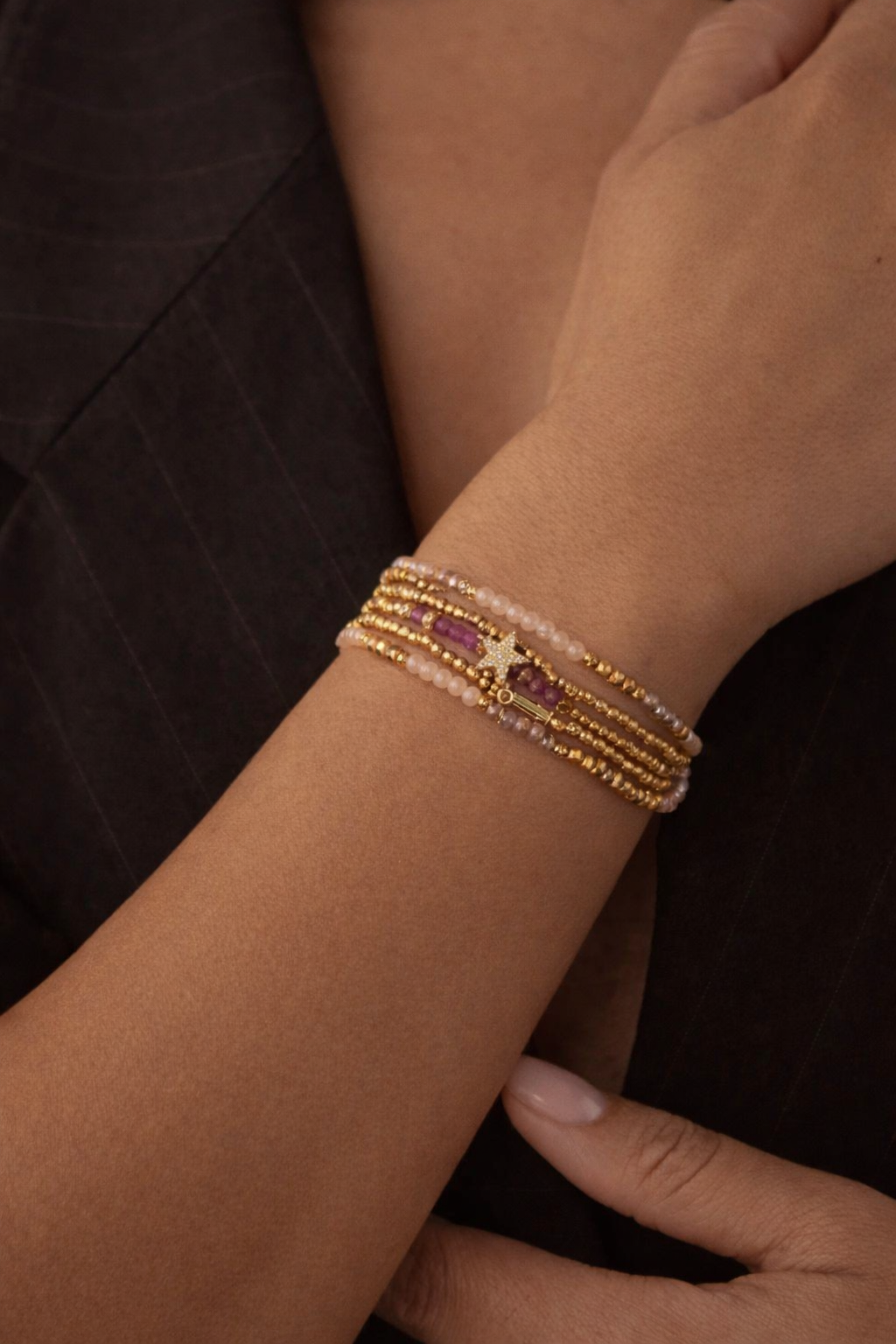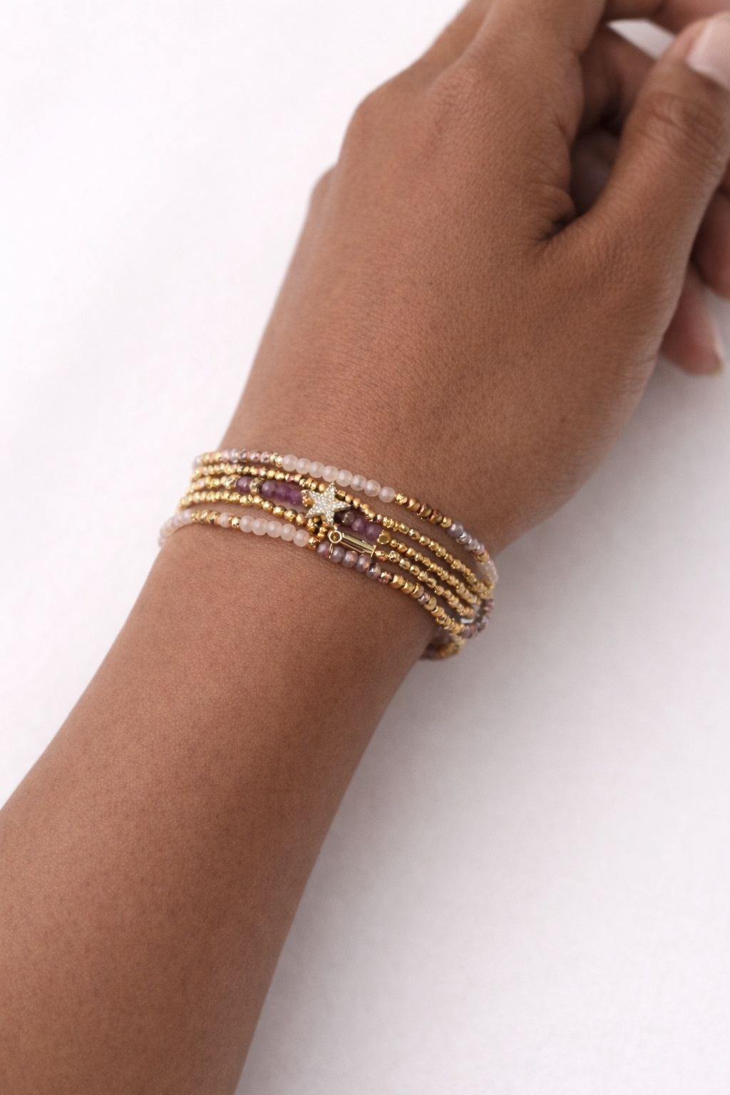 Bracelet en multi-rang en perles fines composé d’une étoile en acier inoxydable. Peux se porter en collier. Pensés pour se compléter avec un autre bracelet.